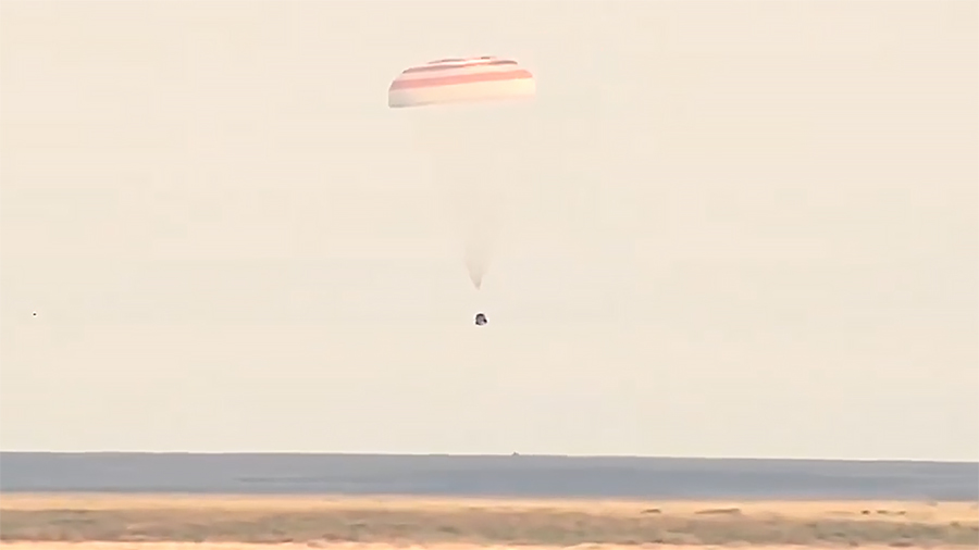 The Soyuz MS-26 spacecraft descends to a parachute-assisted landing in Kazakhstan just over three hours after undocking from the International Space Station.