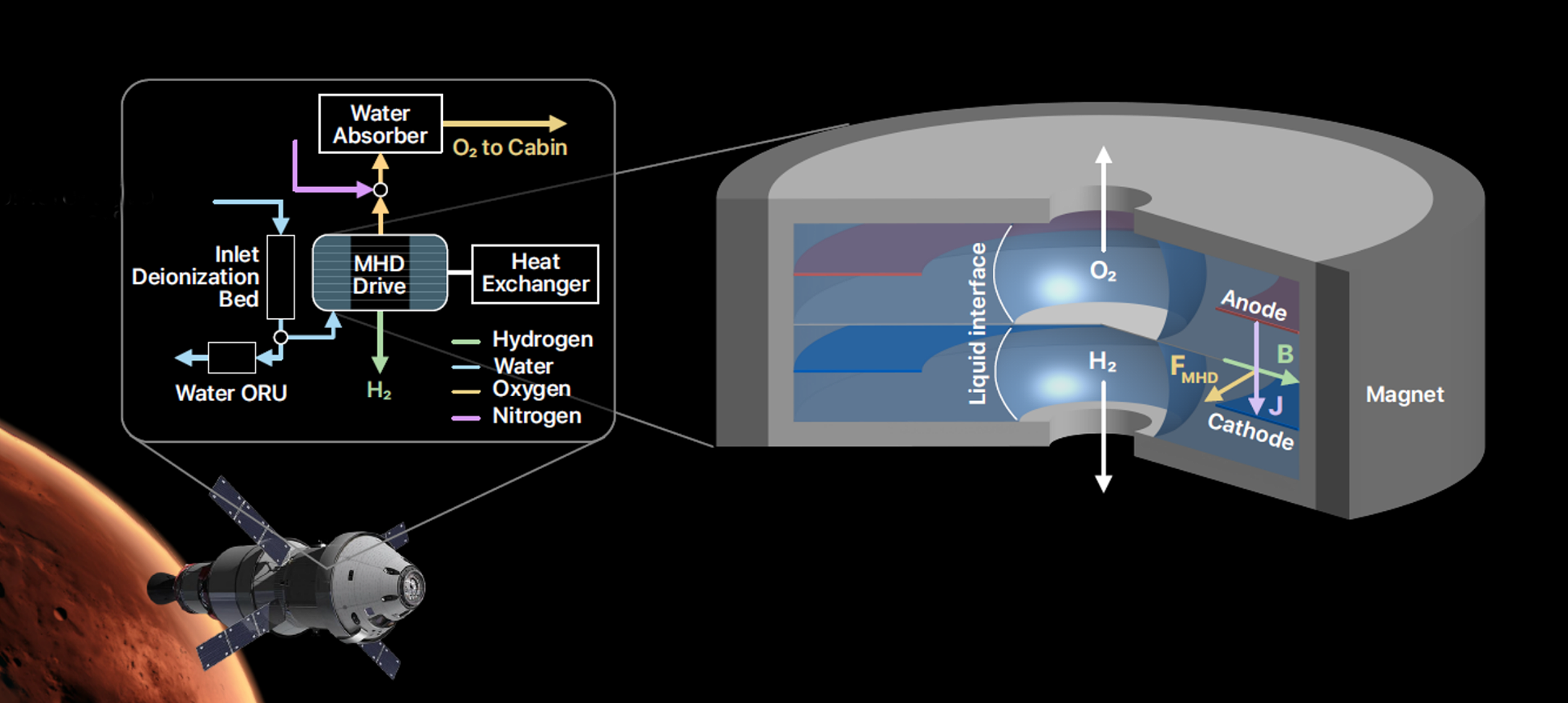 During our Phase I NIAC effort, we demonstrated the basic feasibility of a novel water-splitting architecture that leverages contactless magnetohydrodynamic (MHD) forces to produce and separate oxygen and hydrogen gas bubbles in microgravity. The system, known as the Magnetohydrodynamic Oxygen Generation Assembly (MOGA), avoids the use of forced water recirculation loops or moving parts such as pumps or centrifuges for phase separation. This fundamental paradigm shift results in multiple operational advantages with respect to the state-of-the-art: increased robustness to over- and under-voltages in the cell stack, minimal risk of electrolyte leaching, wider operational temperature and humidity levels, simpler transient operation, increased material durability, enhanced system stability during dormant periods, modest water purity requirements, reduced microbial growth, and better component-level swap-ability, all of which result in an exceptionally robust system. Overall, these architectural features lead to a 32.9% mass reduction and 20.4% astronaut maintenance time savings with respect to the Oxygen Generation Assembly at the ISS for a four-crew Mars transfer, making the system ideally suited for long-duration missions. In Phase II, we seek to answer some of the key remaining unknowns surrounding this architecture, particularly regarding (i) the long-term electrochemical and multiphase flow behavior of the system in microgravity and its impact on power consumption and liquid interface stability, (ii) the transient operational modes of the MHD drive during start-up, shutdown, and dormancy, and (iii) architectural improvements for manufacturability and ease of repair. Toward that end, we will leverage our combined expertise in microgravity research by partnering with the ZARM Institute in Bremen and the German Aerospace Center to fly, free of charge to NASA, a large-scale magnetohydrodynamic drive system and demonstrate critical processes and components. An external review board composed of industry experts will assess the evolution of the project and inform commercial infusion. This effort will result in a TRL-4 system that will also benefit additional technologies of interest to NASA and the general public, such as water-based SmallSat propulsion and in-situ resource utilization.