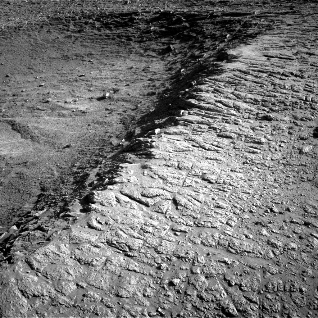 Curiosity is continuing its winding path through the mysterious boxwork structures that have been a major focus of the last several months of the mission. After driving away from “Río Frío,” we are now parked on top of a ridge overlooking a topographic depression that we’ve nicknamed the “Thumb.” The image on this post shows that ridge running along the “thumb’s” edge. Our goal today is to characterize this ridge before we drive down into the Thumb.