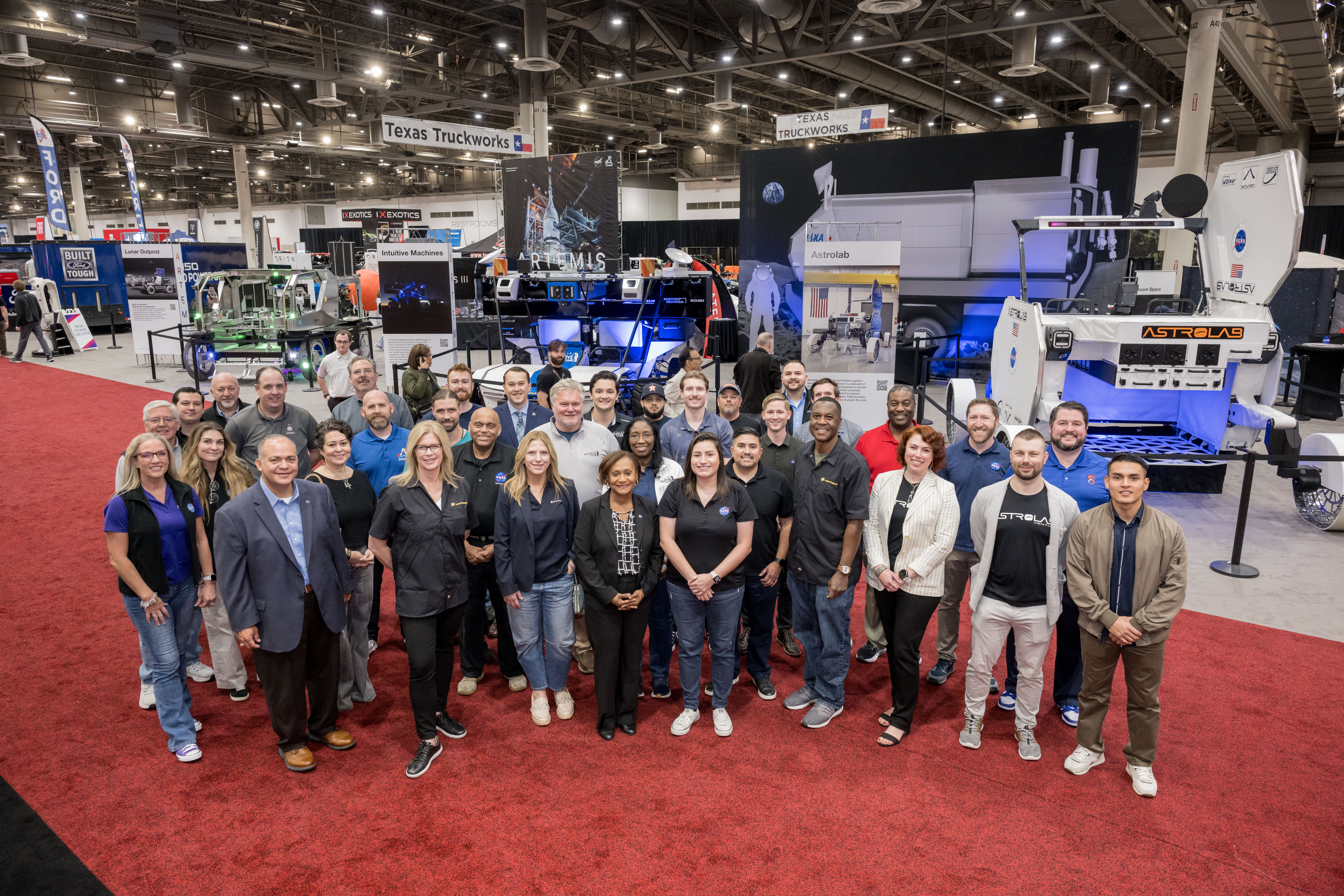 Group photo of individuals standing on a red carpet at a convention center, surrounded by exhibits showcasing space exploration technology.Johnson Space Center employees present the Artemis exhibit at the 2025 Houston AutoBoative Show at NRG Center.NASA/Robert Markowitz  The Artemis exhibit stood alongside some of the world’s most advanced cars and boats, offering visitors an up-close look at lunar terrain vehicle mockups from Astrolab, Intuitive Machines, and Lunar Outpost. Later this year, NASA will select the rover that will fly to the Moon as humanity prepares for the next giant leap.