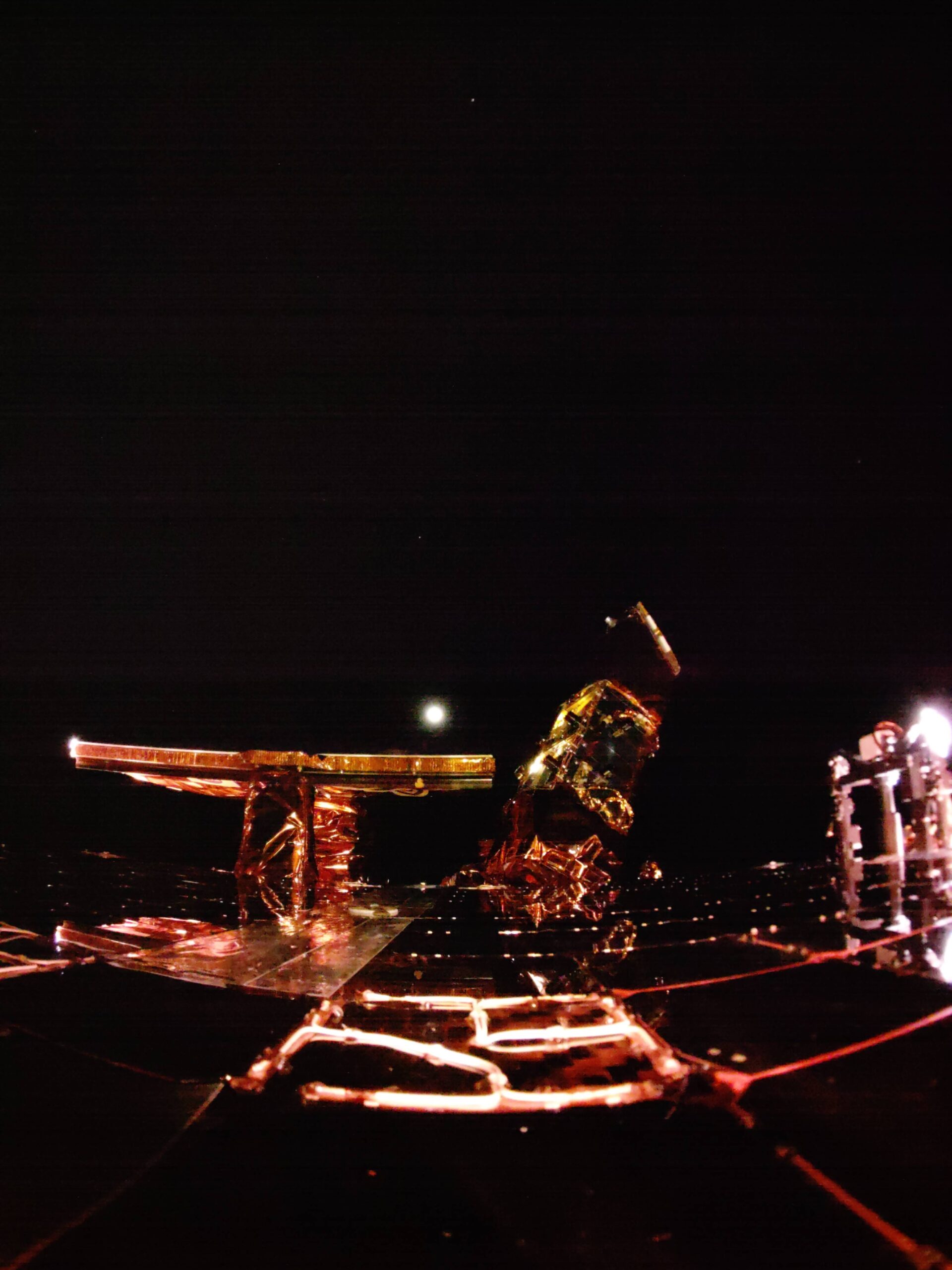 An image from the top deck of Firefly's Blue Ghost lunar lander in the darkness of space with the lit Moon in the distance.