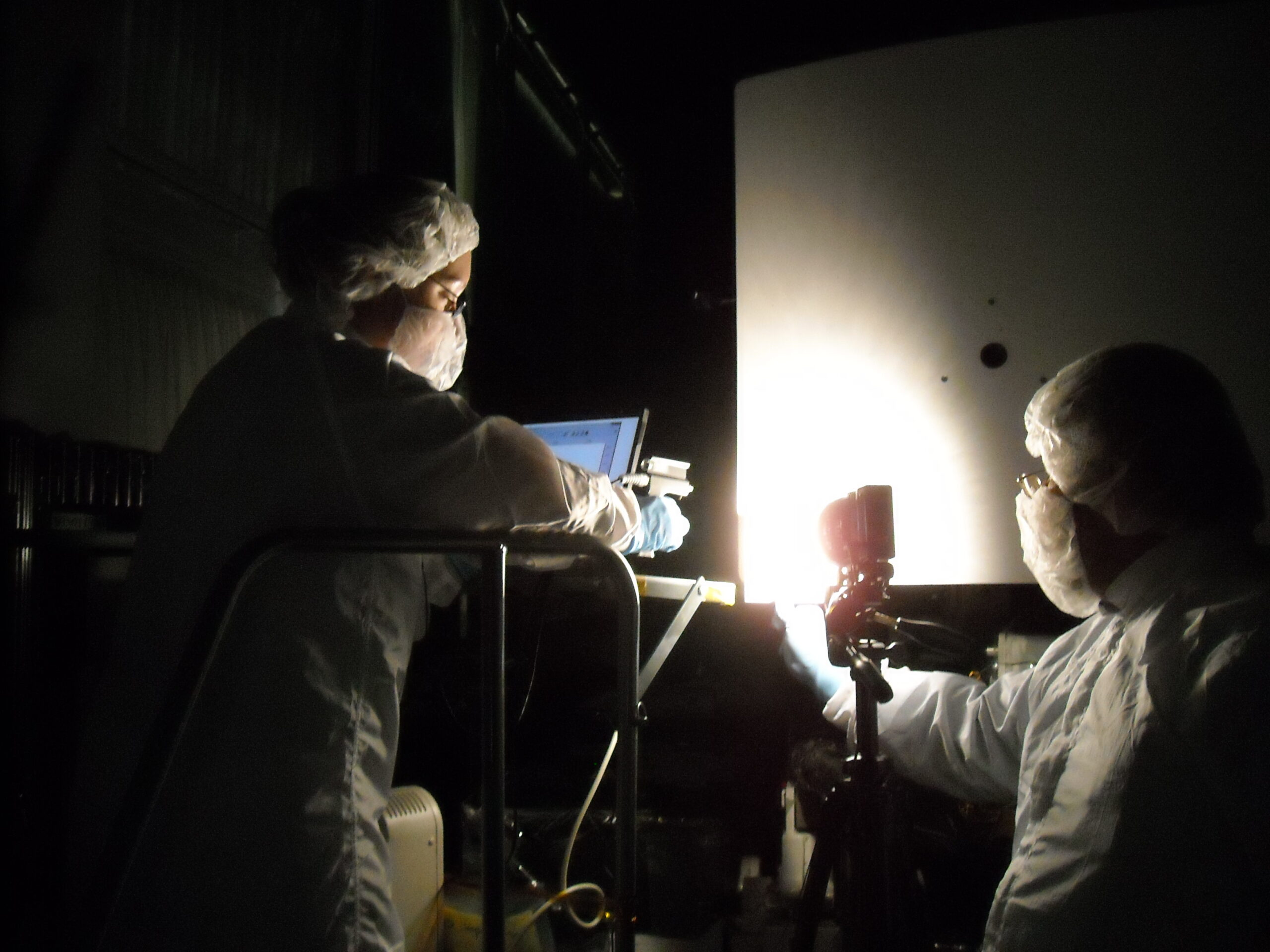 Heather Cowardin, left, holds a spectrometer optical feed as she prepares to take a spectral measurement acquisition on the returned Wide Field Planetary Camera 2 radiator. It was inspected by the Orbital Debris Program Office team for micrometeoroid and orbital debris impacts at NASA’s Goddard Space Flight Center in Greenbelt, Maryland, in 2009, and later studied for space weathering effects on its painted surface. Her passion was fueled further by a mentor, Dr. James R. Benbrook, a University of Houston space physics professor and radar scientist supporting the Orbital Debris Program Office. “He was a hard-core Texas cowboy and a brilliant physicist,” she said. “He brought me on as a NASA fellow to study orbital debris using optical imaging. After that, I was committed to working at NASA—no matter what it took.”