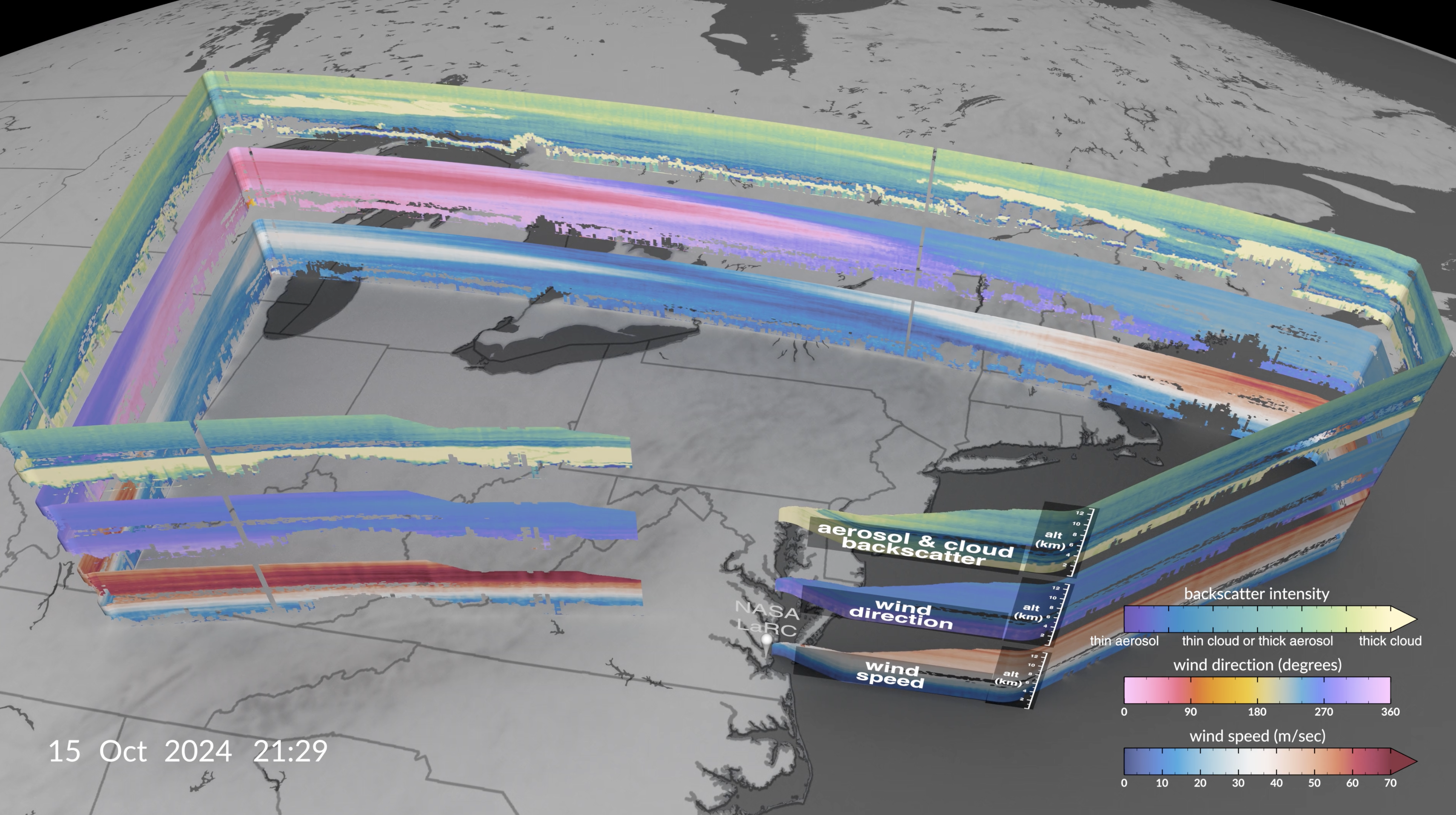 5 Min Read NASA 3D Wind Measuring Laser Aims to Improve Forecasts from Air, Space A grey map of the Northeastern United States is the background image, and colorful lines illustrating data gathered along the aircraft's path is broken into three titles aerosol and cloud backscatter, wind direction, and wind speed. 3D wind measurements from NASA’s Aerosol Wind Profiler instrument flying on board a specially mounted aircraft along the East Coast of the U.S. and across the Great Lakes region on Oct. 15, 2024. Credits: NASA/Scientific Visualization Studio Since last fall, NASA scientists have flown an advanced 3D Doppler wind lidar instrument across the United States to collect nearly 100 hours of data — including a flight through a hurricane. The goal? To demonstrate the unique capability of the Aerosol Wind Profiler (AWP) instrument to gather extremely precise measurements of wind direction, wind speed, and aerosol concentration – all crucial elements for accurate weather forecasting.