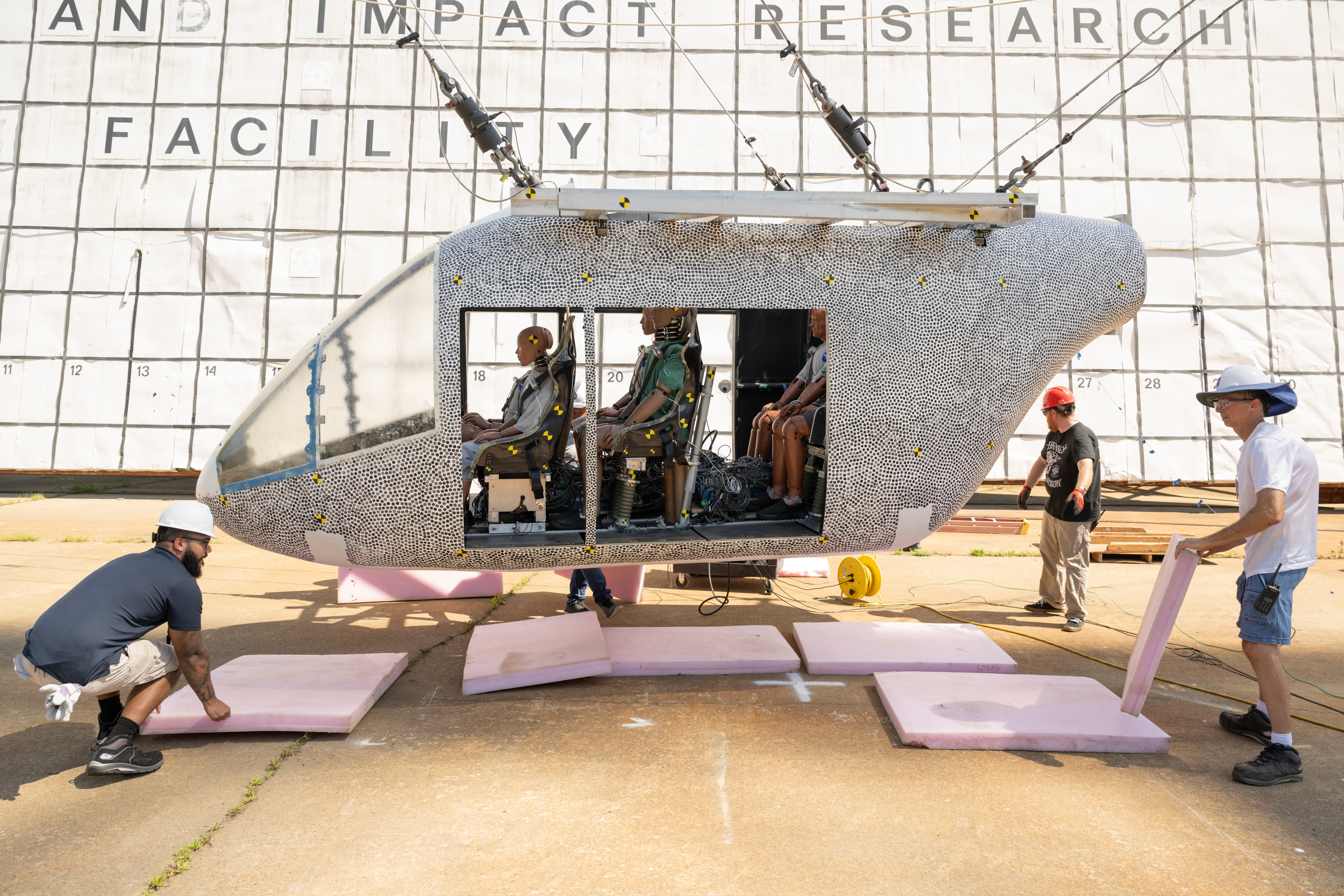An aircraft body modeled after an air taxi with weighted test dummies inside is being prepared for a drop test by researchers at NASA’s Langley Research Center in Hampton, Virginia. The test was completed June 26, 2025, at Langley’s Landing and Impact Research Facility. The aircraft was dropped from a tall steel structure, known as a gantry, after being hoisted about 35 feet in the air by cables. NASA researchers are investigating aircraft materials that best absorb impact forces in a crash.NASA/Mark Knopp As the aviation industry works to design air taxis and other new electric aircraft, there’s a growing need to understand how the materials behave. That’s why NASA is investigating potential air taxi materials and designs to best protect passengers in the event of a crash.