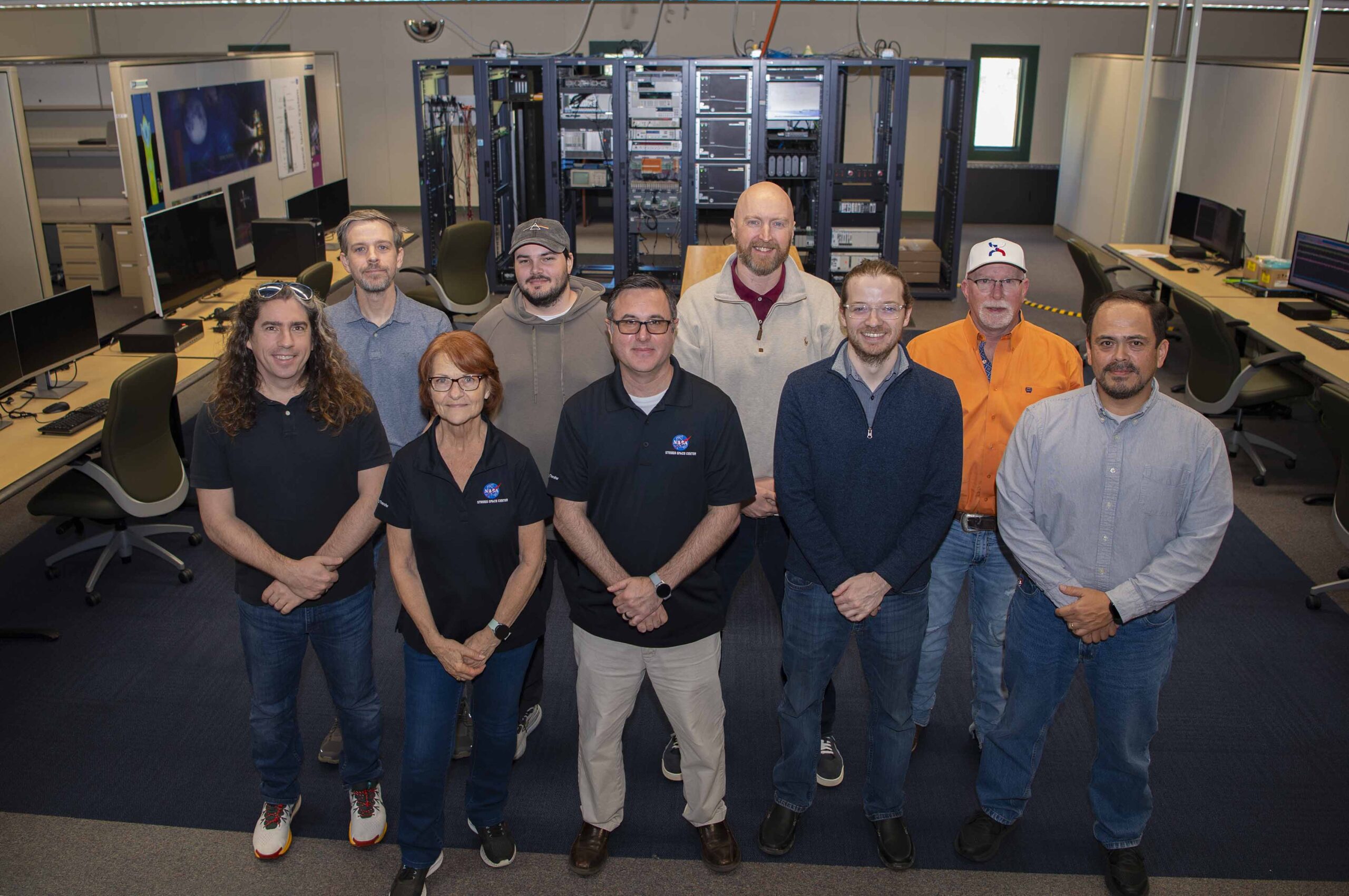 A blended team of NASA personnel and contractors support ongoing development and operation of the NASA Data Acquisition System at NASA’s Stennis Space Center. Team members include, left to right: Andrew Graves (NASA), Shane Cravens (Syncom Space Services), Peggi Marshall (Syncom Space Services), Nicholas Payton Karno (Syncom Space Services), Alex Elliot (NASA), Kris Mobbs (NASA), Brandon Carver (NASA), Richard Smith (Syncom Space Services), and David Carver (NASA)NASA/Danny Nowlin