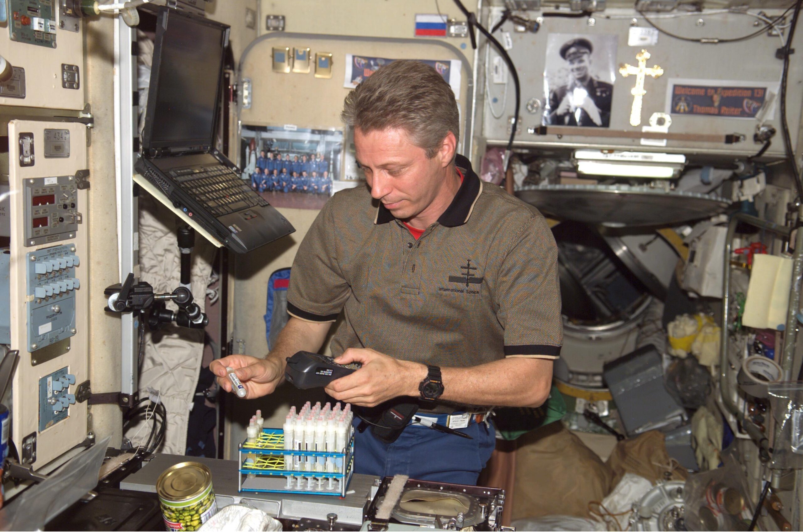 ISS Expedition 13 Flight Engineer, Thomas Reiter, on board ISS processes samples for the Renal Stone investigation.NASA Exposure to microgravity induces bone atrophy/bone loss which increases circulating calcium, impacting the renal stone risk. Risk mitigation strategies including exercise and hydration are well-defined although the ability to treat a renal stone during exploration missions is not yet available.