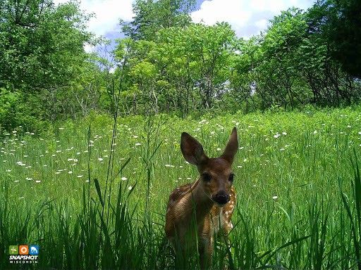 A young deer stands in a lush green meadow surrounded by wildflowers and trees, captured by a Snapshot Wisconsin trail camera. A white-tailed deer fawn photographed on a Snapshot Wisconsin trail camera in Vernon County, WI Credit: WI DNR The Snapshot Wisconsin project recently collected their 100 millionth trail camera photo! What’s more, this milestone coincides with the project’s 10-year anniversary. Congratulations to the team and everyone who’s participated!
