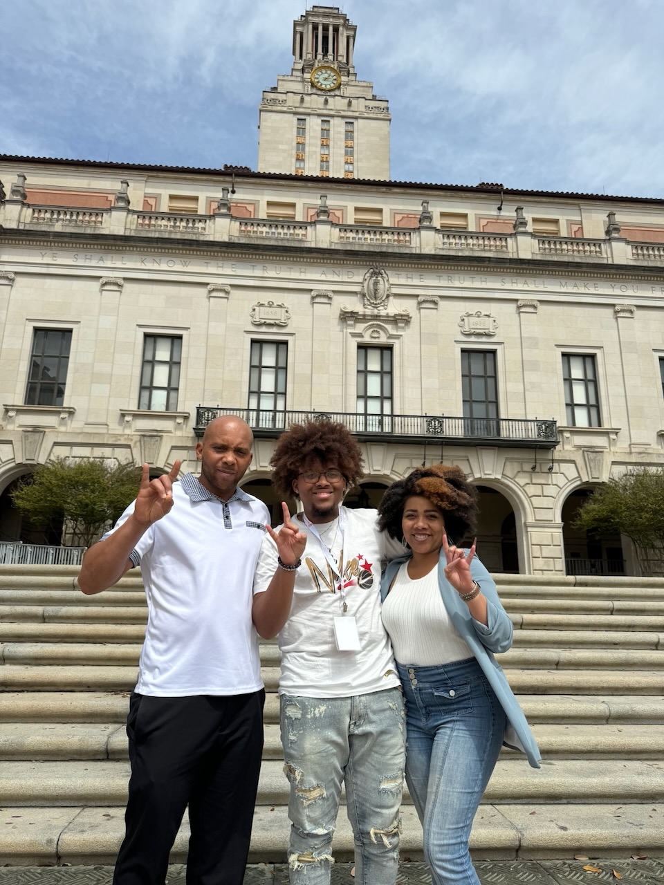 Jaylon Collins with his parents at the University of Texas at Austin after being accepted as a student class of 2028. “HAS showed me that a career in STEM doesn’t require a label, only your passion,” Collins said. “I saw that STEM could lead to endless career paths, and the guide was whatever I was most passionate about.”